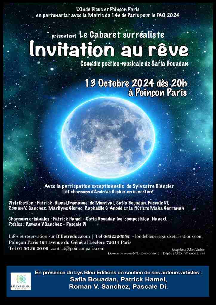 En juillet 2024, elle crée un Cabaret surréaliste Invitation au rêve pour la clôture du Festival des Acteurs du Livre du Quatorzième, axé sur le surréalisme et piloté par la mairie du 14e. Ce spectacle sera joué le 13 octobre 2024 dès 20h à Poinçon Paris. Passionnée par le genre thriller psychologique, elle a sorti son primo roman à suspense Sang vie au Lys Bleu Editions -partenaire sur cet évènement- pour lequel elle a réuni trois de ses complices à la scène et ami-e-s, des auteur-e-s- poètes-esse- et romanciers : Patrick Hamel, Roman V.Sanchez et Pascale Di.