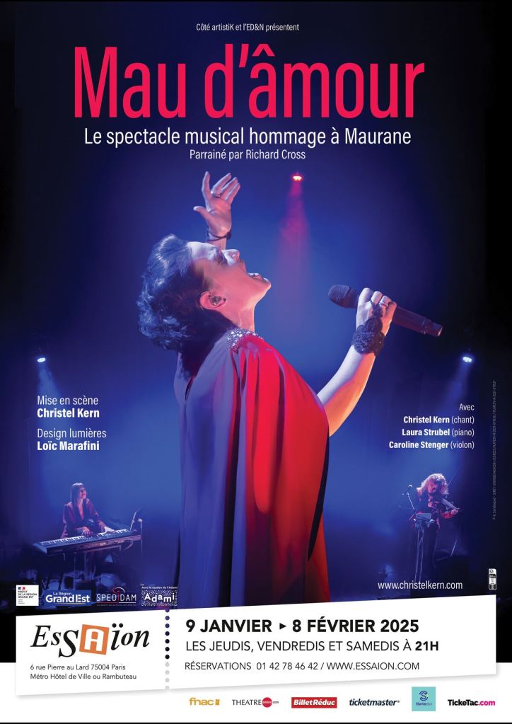 Amour, humanisme, solidarité, féminisme… autant de thèmes chers à Maurane, grande voix de la chanson francophone. Sensible à ces engagements, Christel Kern lui rend hommage avec Mau d’âmour, un spectacle vibrant et raffiné. Accompagnée par Laura Strubel (piano) et Caroline Stenger (violon électrique), elle offre un moment intense, entre émotion et humour. Dans l’écrin intime de l’Essaïon Théâtre, son interprétation puissante transporte le public pour une parenthèse musicale.