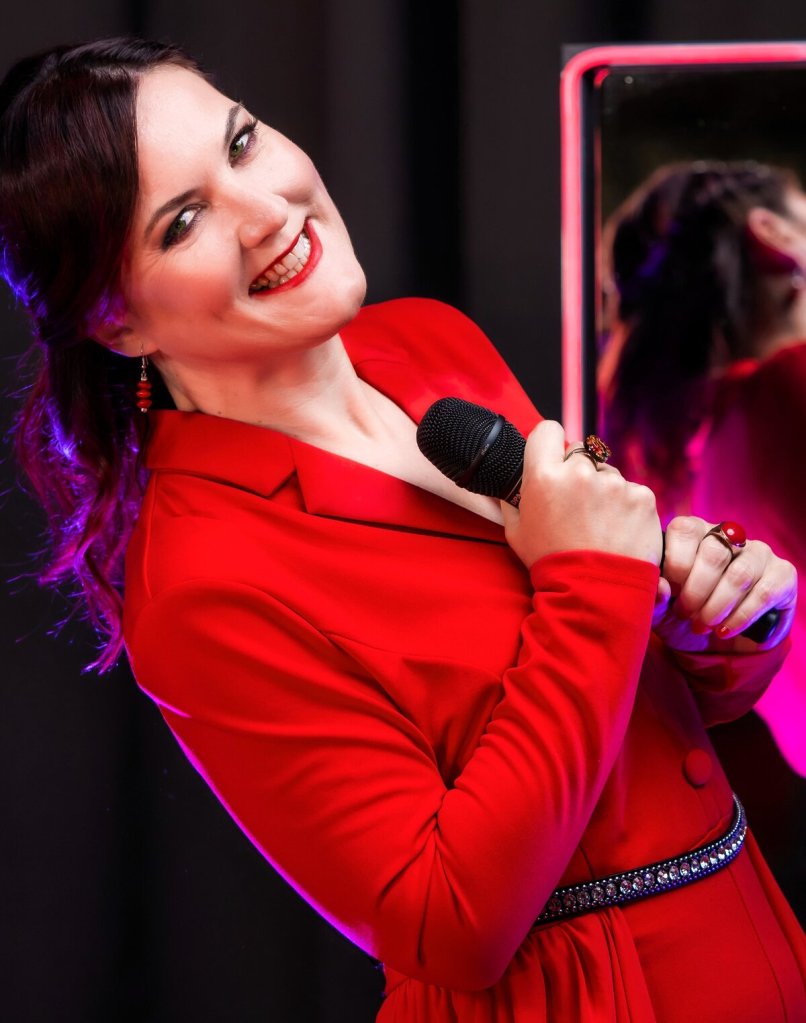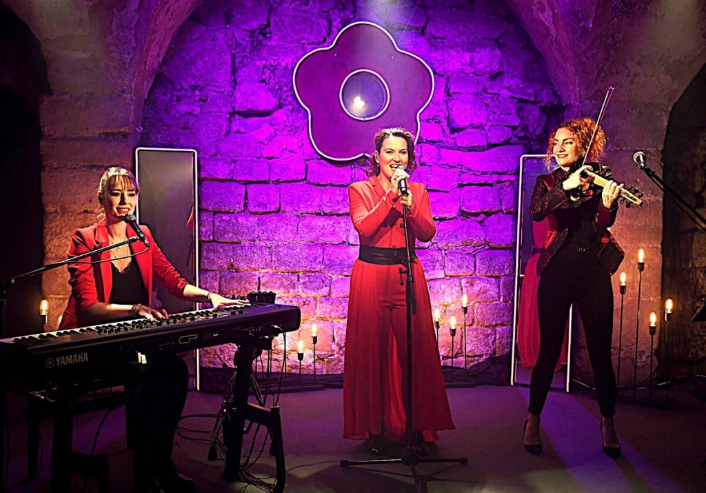 Le choix du trio féminin est apparu naturellement dès le début du projet. Je connaissais déjà Laura Strubel, médaille d’or du conservatoire de Strasbourg en piano, et selon mon analyse et la couleur des arrangements que je souhaitais, il me fallait une violoniste. En tant que programmatrice, j’ai eu l’occasion de sélectionner Caroline Stenger et j’ai pu constater qu’elle chantait. Possédant aussi une médaille d’or du conservatoire, je n’avais pas de doute sur la qualité de mes recrues. La bonne surprise fut le 5 janvier 2021, lors de la première répétition où, pour mon plus grand bonheur, nos 3 voix s’harmonisent parfaitement, c’est le 4ème instrument du projet ! J’y ai associé Damien Schubert, chef de chœur pour travailler des harmonies vocales extrêmement pointues et pour la musique, le pianiste de jazz, Grégory Ott, pour la couleur jazzy que je souhaitais apporter dans les arrangements. Loïc Marafini, célèbre designer lumières, nous a créé un écrin sur mesure pour l’Essaïon Théâtre. Il a collaboré avec Claudio Capéo, Véronique Sanson ou encore le chanteur Christophe… Je l’ai rencontré pour la création lumière de mon avant dernier spectacle avec mes compositions, Ma vie en rose, à l’ED&N en Alsace, et nous sommes devenus amis et complices. C’est un petit génie très innovant. Je voulais une grande fleur pour symboliser la femme, mais aussi appuyer mon identité visuelle. Le résultat est sublissime et au-delà de la musique, le public parle beaucoup de la création lumières impliquant plus de 100 tops pour 1h15 de spectacle. J’ai une équipe de rêve et j’en suis fière.