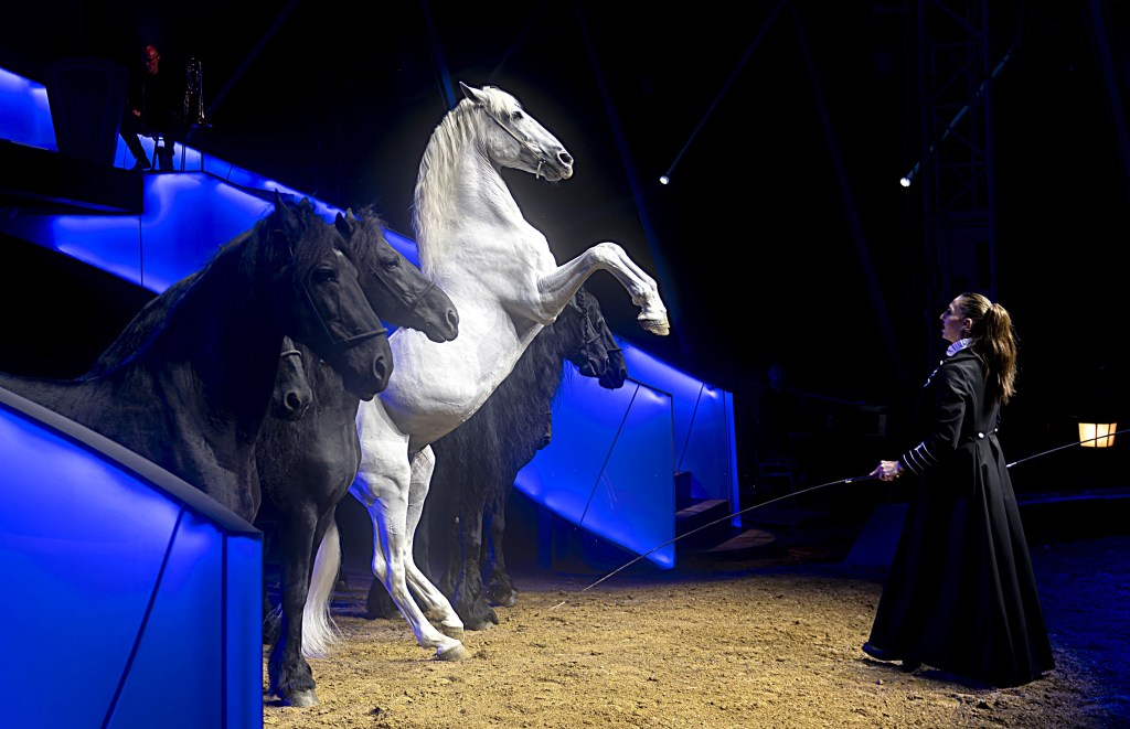 Pas moins de cinquante chevaux de races parfois très rares, entourés et dressés avec brio par leur talentueuse maîtresse dompteuse Maud Gruss. En tout, se produisent sur la piste : quatorze artistes d’exception avec sept talentueux musiciens d’orchestre jouant en live des titres originaux, en lien avec leur histoire familiale incarnée par celle vécue par Gipsy et Alexis Gruss, et composés et chantés par la chanteuse -directrice vocale- mais aussi pour certains par la famille.
