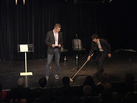 Les personnages sont très bien incarnés par des acteurs tous complices et talentueux : citons Gilles Dyrek, l’auteur metteur en scène campant un informaticien maladroit qui veut tout régler alors que tout tourne mal, le PDG infidèle et sous contrôle fiscal -Stéphane Roux ou Jean- Gilles Barbier – qui va et vient tentant de sauver la convention et sa réputation, face à sa femme décidée à en découdre publiquement -Marine Dusehu excellente pour sa première ce soir là- . Ou encore le directeur qui préfère regarder son match, le coach sous adrénaline musclée, la jeune assistante qui se trouve plongée dans ce capharnaüm, sans avoir rien demandé que de bien faire son job, et enfin le technicien qui voudrait bien être une star entre deux discours…On est dans de beaux draps, bien sales ! Stéphane -Gilles Dyrek, poussif à souhait, n’a plus qu’à passer la serpillère !!