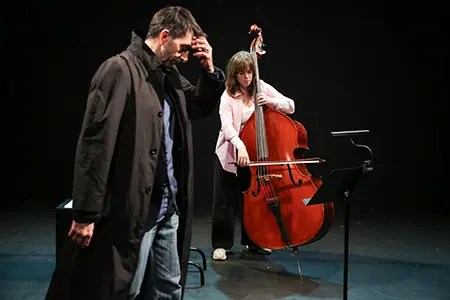 En effet, la contrebasse placée au centre de la scène devient quasiment un personnage à part entière : amie fidèle, elle accompagne Lola dans ses moments de bonheur, de frustration et de rage et elle en devient aussi le fil rouge musical pour le plus grand bonheur de nos oreilles. La mise en scène de Bénédicte Budan est fluide et efficace, elle porte des acteurs talentueux -Alexis Desseaux , charismatique, en pleine maîtrise de son art dans la manipulation savante de son élève- -.