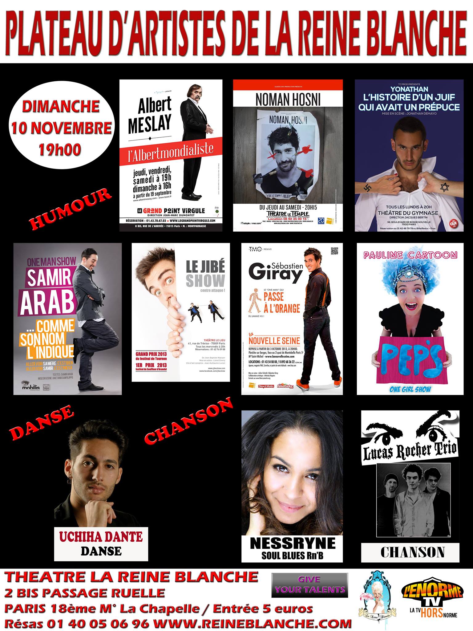 Ce dimanche 10 novembre, nous nous retrouvons tous au Théâtre de la Reine Blanche à 19h pour découvrir le nouveau plateau d’artistes dans une ambiance fort sympathique : nous y voyons ainsi défiler des talents jeunes ou plus confirmés telle la chanteuse de 18 ans Nessryne , préparant un album et en Ière partie avec Moiz-ex chanteur de Tribal Jam ou encore les allumés du groupe « Lucas Rocher Trio», les danseurs Uchiha Dante et Lorenzo DS de l’AID -Académie Internationale de Danse- …Les humoristes ne sont pas en reste tant ils sont aussi divers que prometteurs :citons Sébastien Giray qui n’est plus à présenter ,animateur de l’émission jeunesse sur Canal+ « Le Grand Defitoon », il nous présente son numéro dans un personnage auditionnant du nom de Molière !…ou Samy Amara qui se et nous pose de vrais questions sur l’absurdité de notre monde , vainqueur de la Yo Big Battle de MTV et qui sera le 16 novembre au Th de Dix Heures .