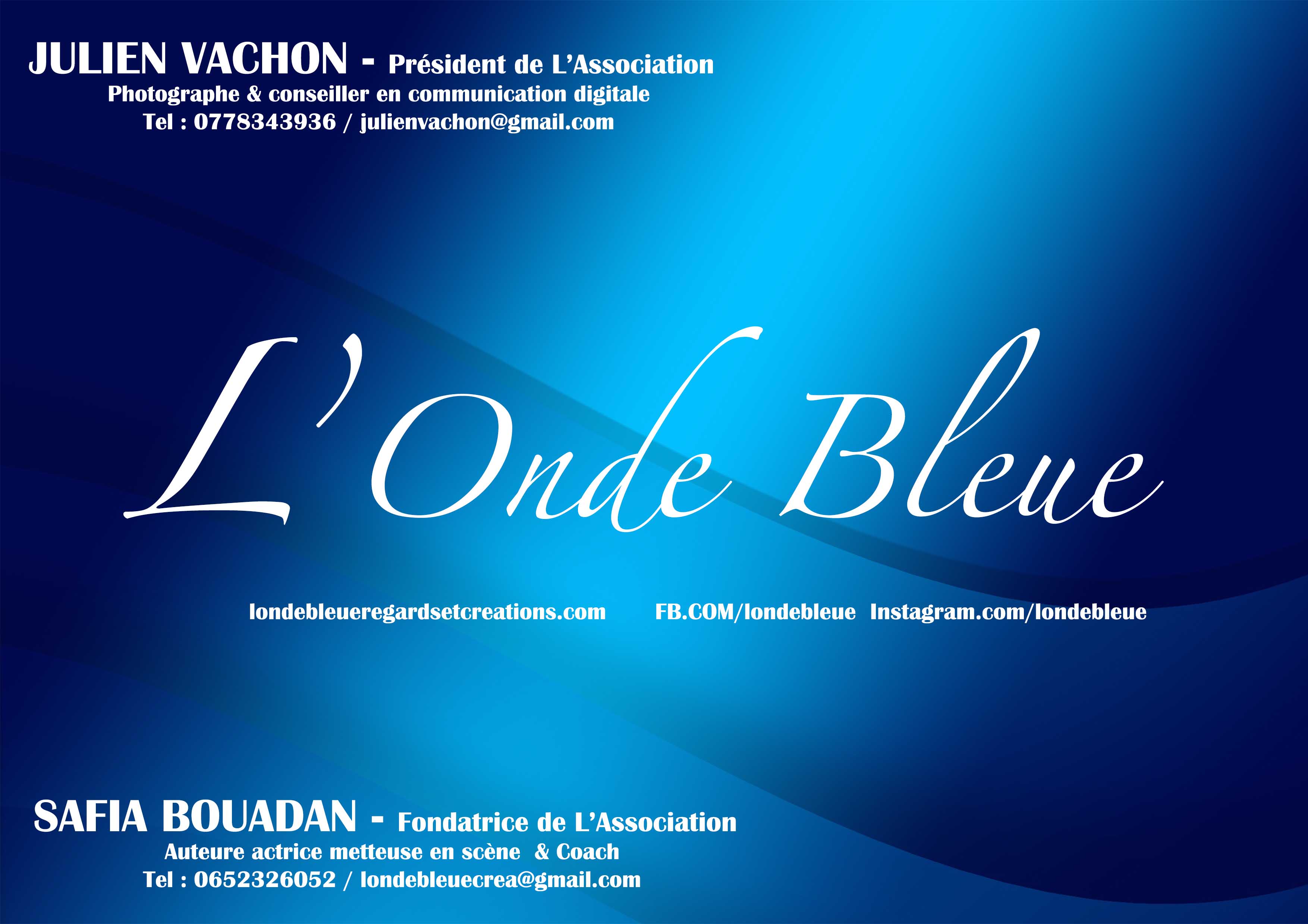 « L’Onde Bleue » regroupe depuis sa création en 2005 des membres venus de tous horizons, artistique, social et culturel .Accréditée en presse , elle soutient aussi la création. Elle a pour but de créer, produire, réaliser ou diffuser dans la mesure de ses moyens, des créations ou des produits artistiques socioculturels ou humanitaires tournés vers une certaine culture de la paix, des droits de l’homme et de l’enfant. L’Onde Bleue est reconnue depuis 2010 comme association éthique par le Geobs de l’Unesco