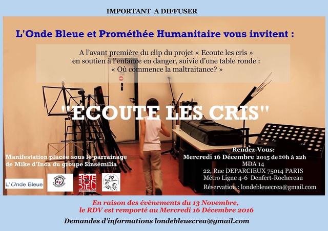 Le projet « Ecoute les cris » …Enfance en danger est né du plateau concert de mars 2015 « Je suis un cri » monté en partenariat avec la mairie du 14e de Paris.