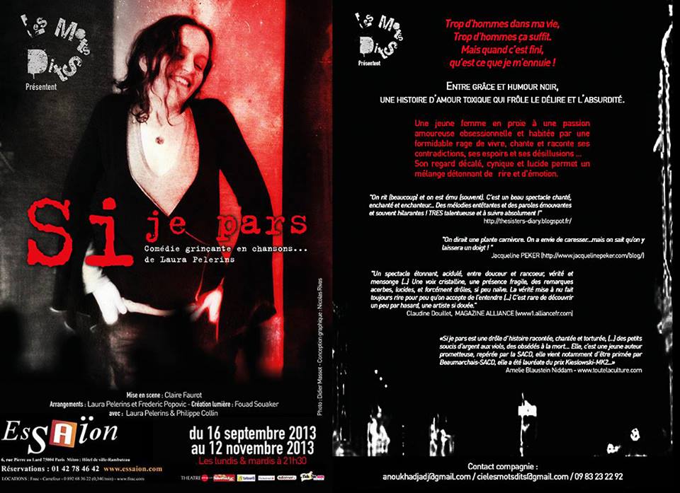 « Si je pars « de Laura Pelerins mis en scène par Claire Faurot avec Laura Pelerins et Philippe Collin au Théâtre de l’Essaïon , les lundi et mardi à 21h30 depuis octobre à novembre 2013.