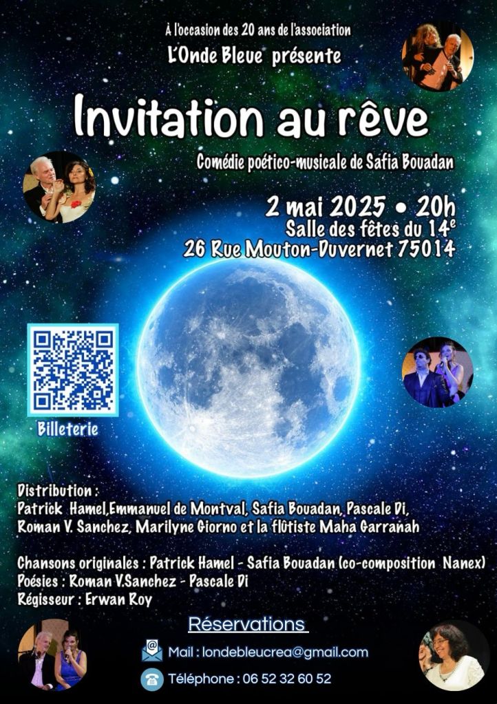A l’occasion des 20 ans de notre structure L’Onde Bleue , notre comédie poético- musicale et joyeuse revient le 2 mai 2025 à 20h salle des fêtes au 12 rue Pierre Castagnou-entrée au 26 rue Mouton Duvernet -Paris 14e- .